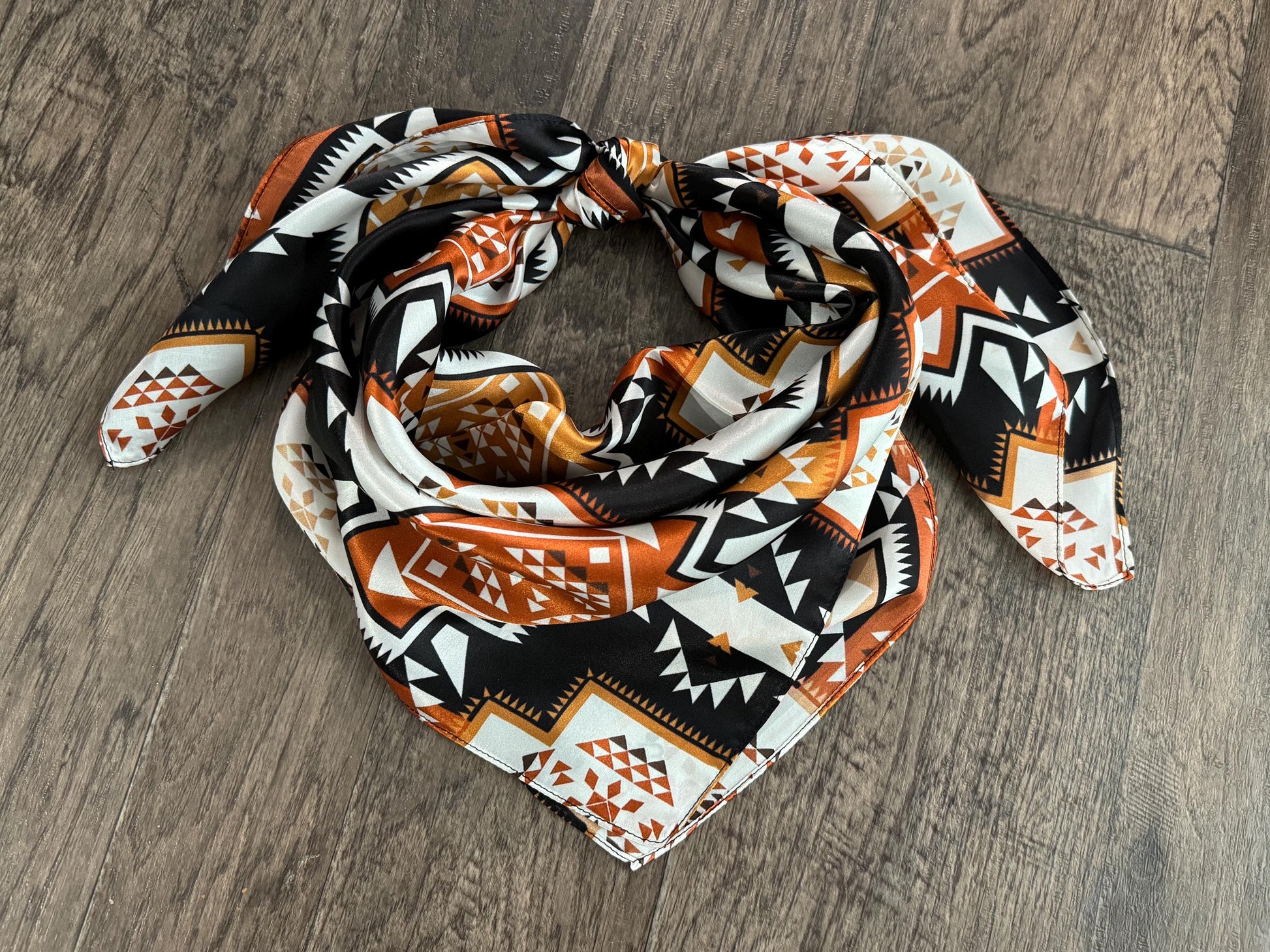 100% Silk Wild Rag Aztec Native tribal inspired pattern of brown, black, and white by Double B Wild Rags