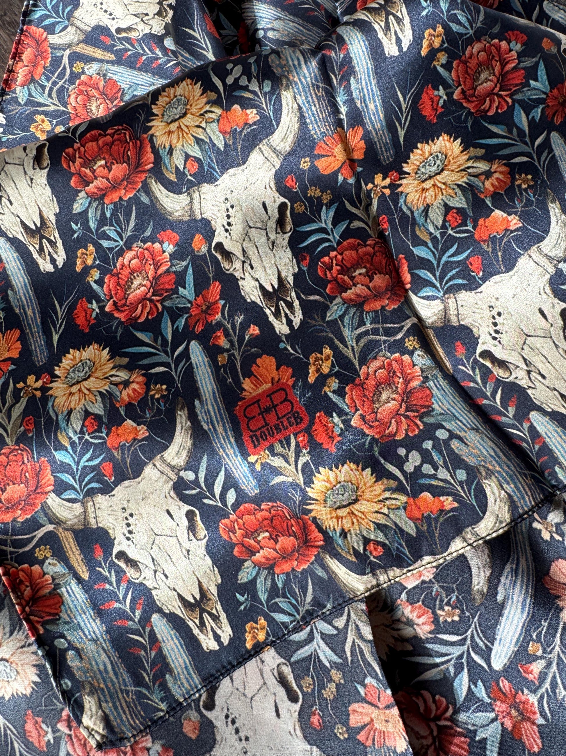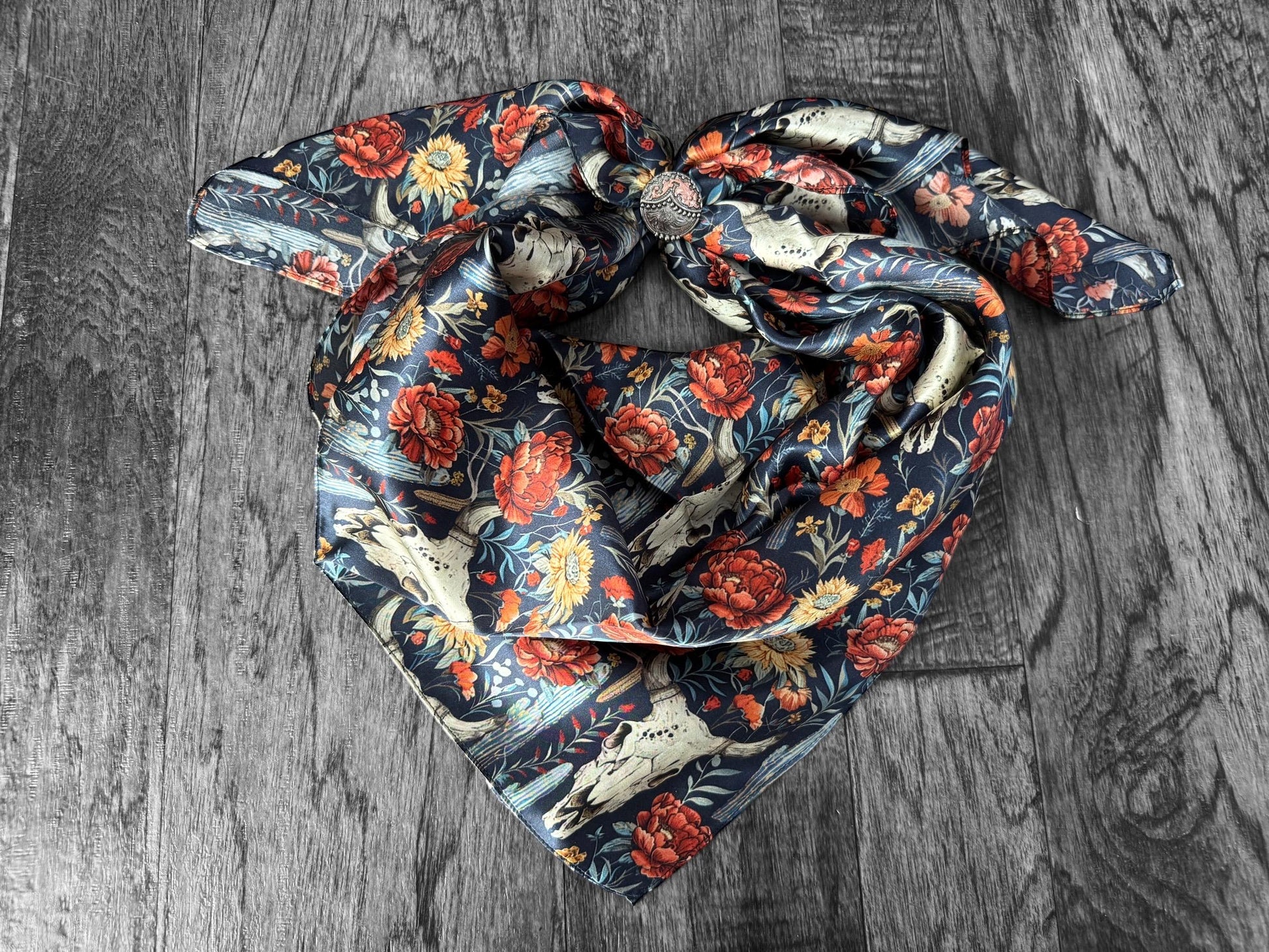 100% Silk Wild Rag Navy Blue Cow skulls and Cactus Double B Wild Rags