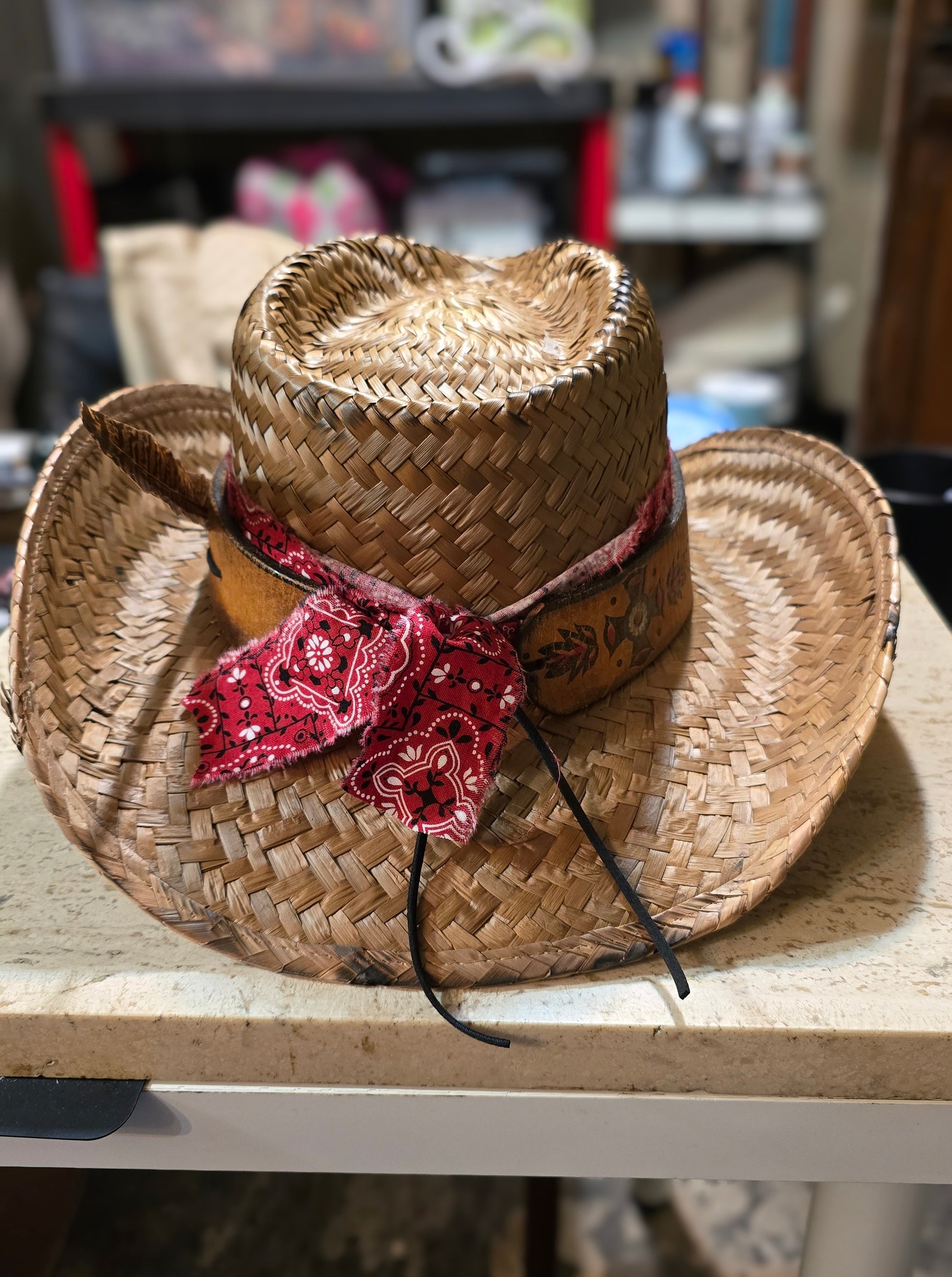 The 3 Strikes Straw Cowboy Hat with Vintage Leather Hatband and Playing Card Accessory is the perfect compliment to your outfit and is bound to spark conversation. The extra slot on the hatband is the perfect spot for your lucky penny. The elastic sweatband makes it comfortable to wear and fits multiple sizes.