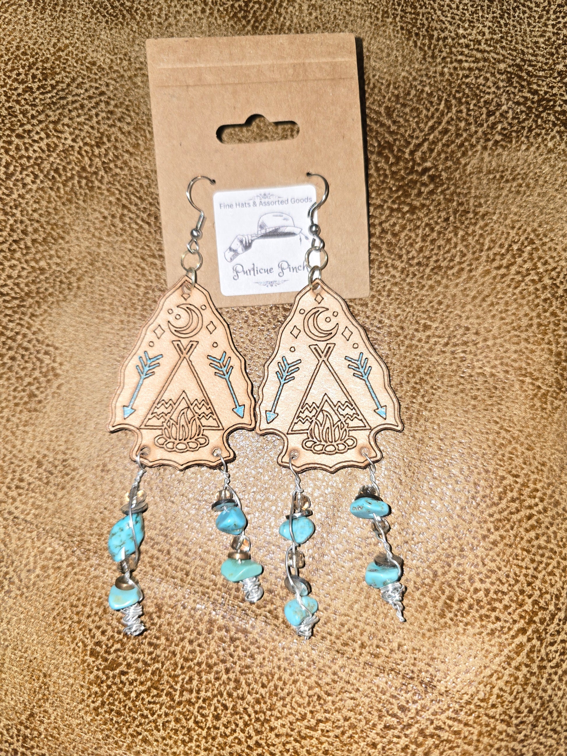 These handmade leather earrings feature an arrowhead-inspired silhouette with layered burned details that create depth and visual interest. The design includes celestial elements, crossed arrows, and landscape-style linework, giving the piece a balanced blend of rustic and symbolic design.