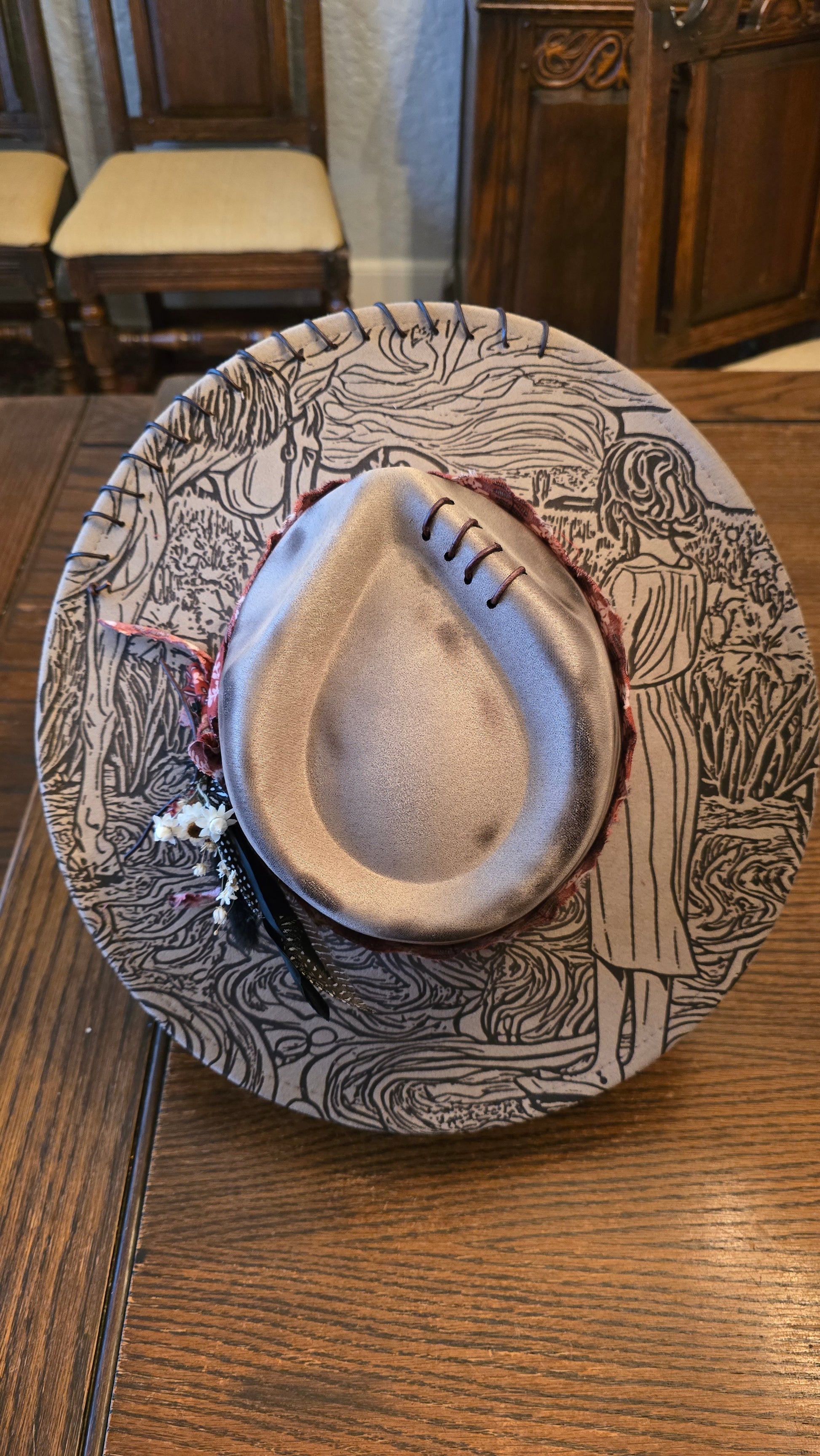 Soft as a prairie breeze and rich with story, Peaceful Pastures is a handcrafted faux suede rancher designed for those who feel most at home under open skies. The wide brim features a dreamy laser-burned illustration of a woman and her horse in a pastoral landscape—detailed with flowing grasses, wildflowers, and gentle movement that evokes calm and connection.