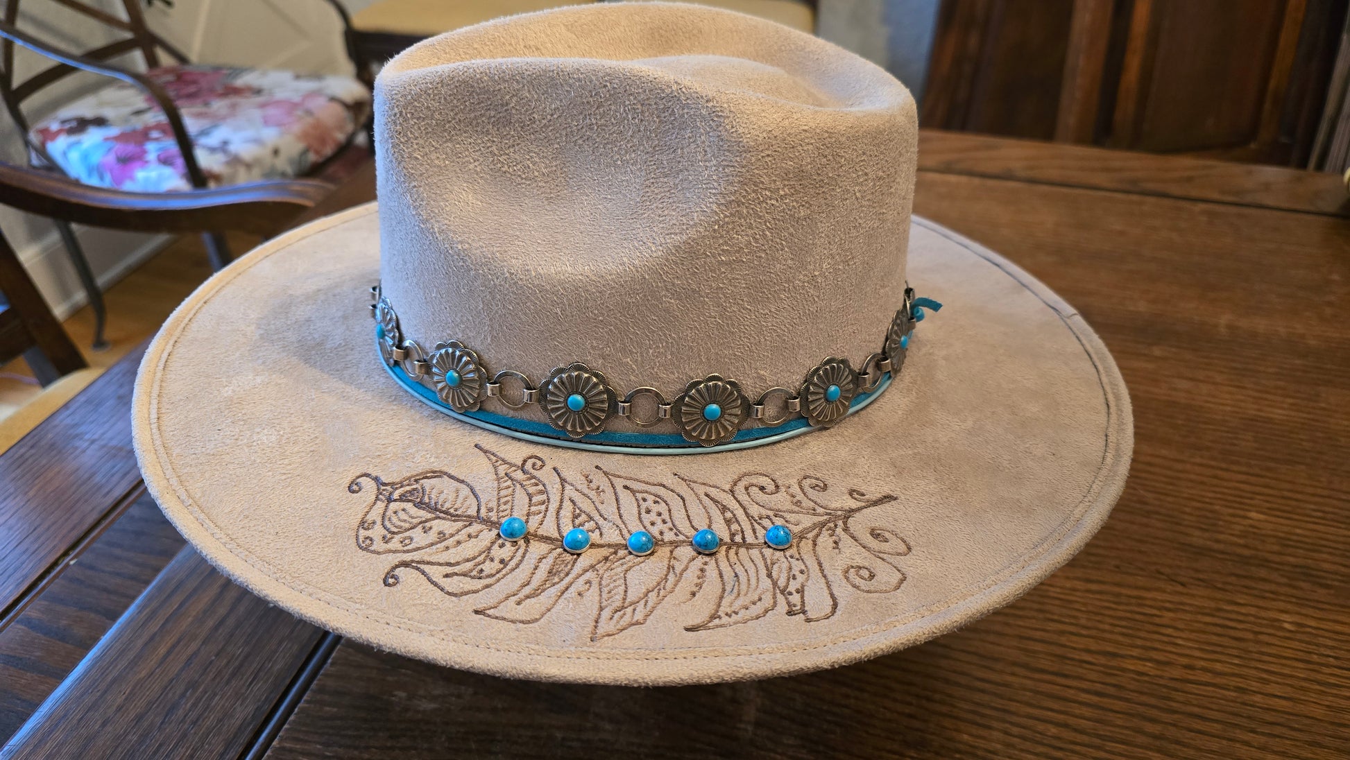 This Silver Spurs Faux Suede Rancher Hat with Concho Hatband features a Hand-Burned feather design on the brim. It is beautifully highlighted with turquoise studs. It is sized a small but has an elastic sweatband that allows for a multi-size fit.