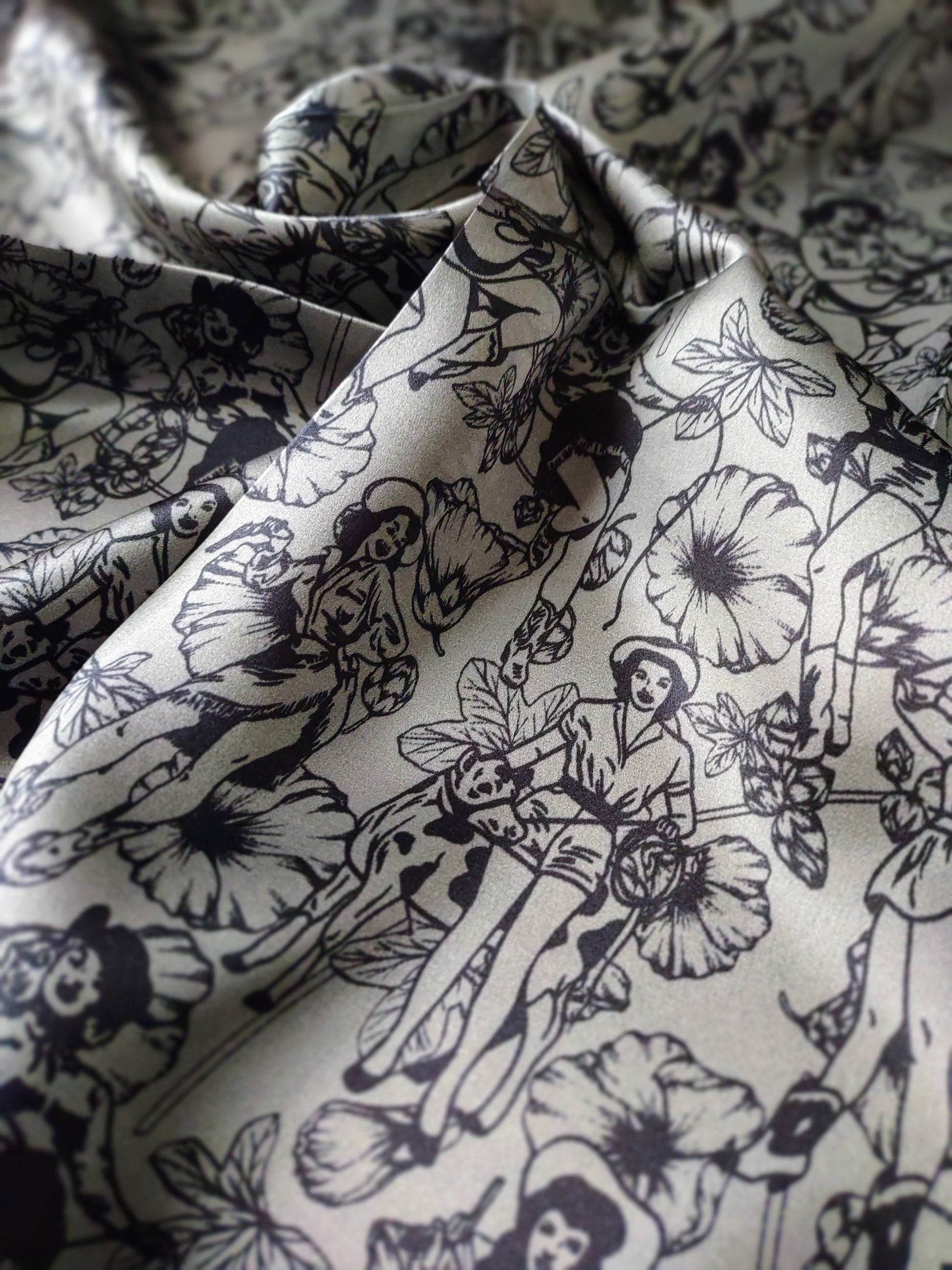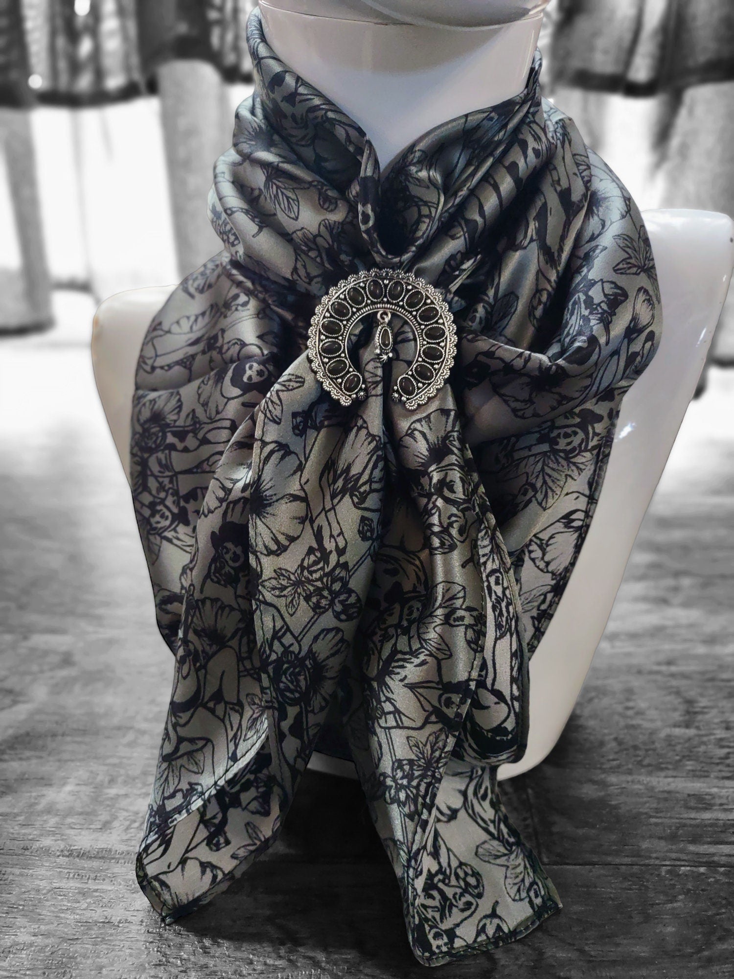 Wild Rag 100% SILK Dark Grey Pin Up Cowgirls and Hollyhock flowers Cowboy Western Neck Scarf Bandanna by Double B Wild Rags